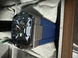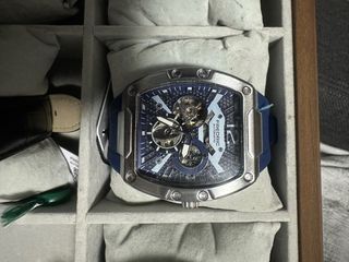 Elegante reloj Frederic con movimiento automático. Su diseño combina tonos azules y plateados, con una correa de goma azul. - Esfera con detalles intrincados. - Mecanismo automático visible. - Correa de goma azul. - Bisel plateado con tornillos decorativos.