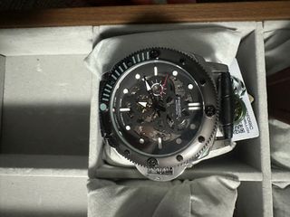Reloj de pulsera con un diseño moderno y llamativo. - Correa de silicona en color verde. - Caja y detalles en plateado. - Esfera con movimiento automático visible.