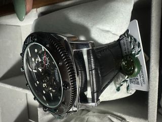 Elegante reloj automático Frederic, modelo Bristol Collection, con un diseño sofisticado. - Esfera negra con detalles plateados. - Correa de cuero negra. - Mecanismo automático visible.