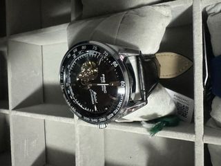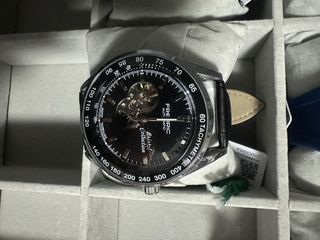 Elegante reloj automático Frederic con diseño de esqueleto. - Caja y bisel en tonos negro y plateado. - Correa de cuero negra. - Mecanismo automático visible.