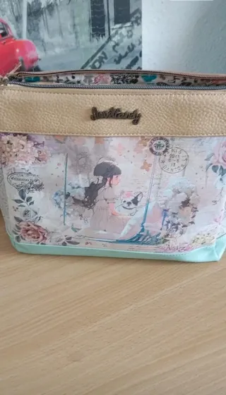 Bolso bandolera con un diseño encantador y romántico. - Estampado de niña con perro y flores. - Detalle metálico de la marca Sweet Candy. - Acabado superior en material texturizado dorado.
