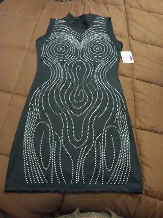 Vestido de mujer con un diseño llamativo y elegante. - Diseño sin mangas. - Cuello alto. - Adornado con pedrería plateada. - Corte ajustado.