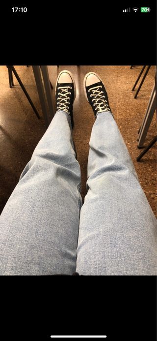 Vaquero de Stradivarius modelo D77. - Corte ancho. - Bolsillos delanteros con botón. - Tiro alto.