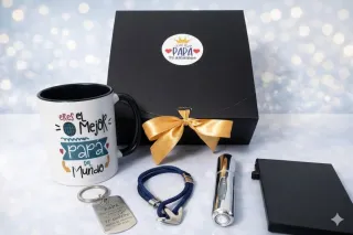 Set de regalo para el Día del Padre. - Taza con diseño El Mejor Papá del Mundo. - Llavero metálico con grabado. - Pulsera con ancla. - Perfumador metálico. - Caja negra con lazo dorado.