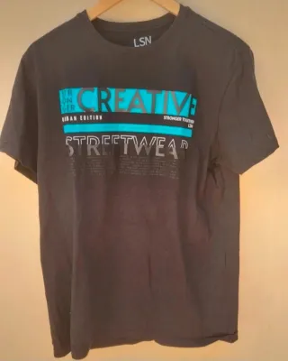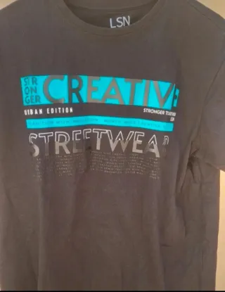 Camiseta con diseño gráfico moderno. - Estampado frontal con texto CREATIVE y STREETWEAR. - Detalle de banda azul turquesa. - Logo LSN en la zona del cuello.