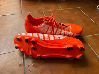 Botas de fútbol Puma en color naranja, talla 45. - Diseño con tacos para césped. - Detalle de texto repetido en el lateral.