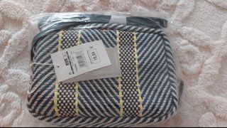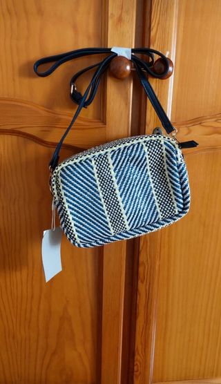 Bolso rectangular con asa larga azul marino con estampado. El material es como rafia suave. Se cierra con cremallera y tiene otra cremallera interior. Esta nuevo, con etiqueta, a estrenar. De Springfield