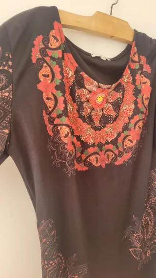 Vestido con manga larga y estampado llamativo. - Parte trasera, mangas y delantera estampada. - Diseño floral en la parte inferior. - Cuello redondo.