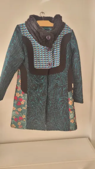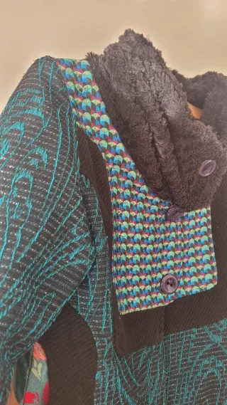 Abrigo estampado, turquesa y verde, botones varios