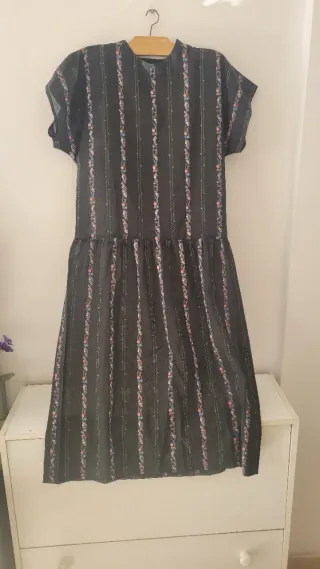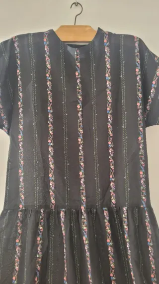 Vestido negro con un estampado de flores rosas y detalles verticales. La tela es transparente, lo que le da un toque delicado. Vestido hecho a mano. Medidas: De axila a axila: 52 cm Cintura : 45 cm Largo: 115 cm
