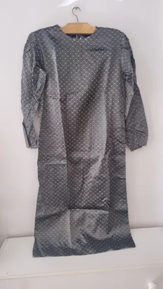 Vestido corto con un estampado sutil de lunares. - Diseño con cuello redondo. - Detalle de botones en los hombros. - Mangas cortas abullonadas.