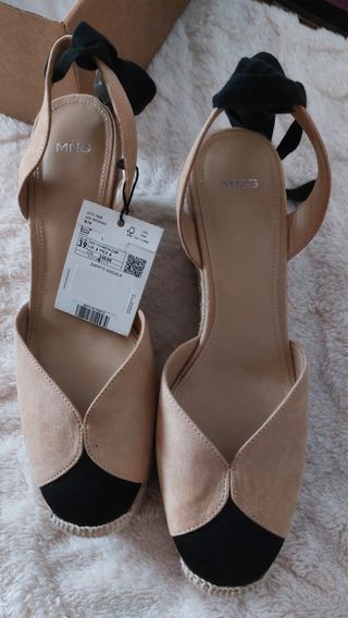 Cuñas de esparto / Esparteñas atadas al tobillo. Punta redonda. Cierre de lazo. Bicolor, beig y negro. Talla 39 de Mango. Están nuevas, con etiqueta y caja, estrenar.