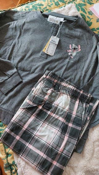 Pijama de manga larga y pantalón largo finito. Licencia de Lilo&Stich. Composición: 100% algodón. Color gris y pantalón de cuadros gris/rosa/blanco. Cinturilla de pantalón elástica con lazo. Talla L de Women'secret. Está nuevo, con etiqueta, a estrenar.