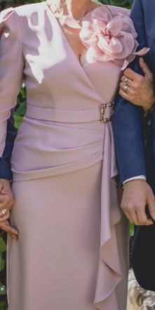 Elegante vestido largo, en tono rosa palo, muy cómodo, ideal para eventos especiales, madrina, invitada boda... - Diseño cruzado con detalle de volante en cascada lateral. - Adorno de pedrería en la cintura. - Manga francesa. - El broche floral decorativo, es opcional, también puede usarse cómo tocado (regalo). - Cartera de mano a juego, si se quiere, 15€ .