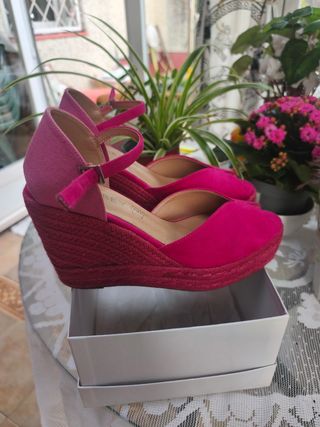 Sandalias de cuña con un vibrante color rosa. - Material exterior de ante. - Cierre de pulsera al tobillo. - Diseño abierto en la punta. - Altura 11cm. - Tan sólo usadas unas horas, muy cómodas.