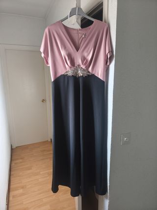 Elegante vestido, acampanado, ideal para eventos especiales. - Cuerpo superior en tono rosa satinado. - Falda larga en color negro. - Detalle de pedrería en la cintura.