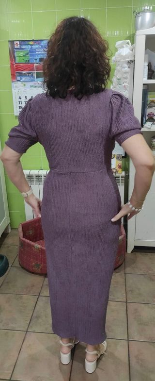 Vestido largo de tejido con textura, elástico y muy cómodo - Diseño con escote cruzado. - Manga abullonada. - Abertura lateral en la falda.