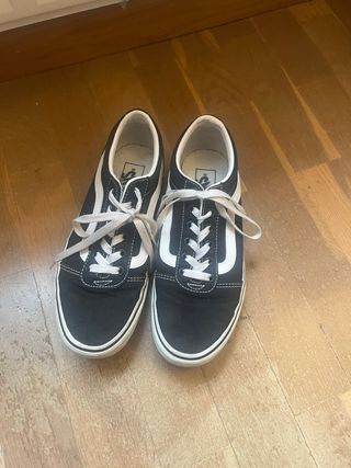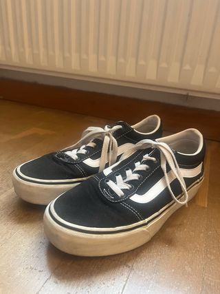 Zapatillas de la marca Vans en color negro y blanco, talla 38. - Diseño clásico con la icónica franja lateral. - Suela de plataforma gruesa.