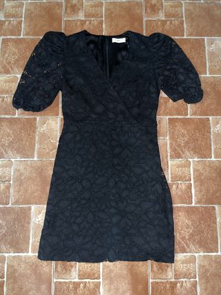 Vestido de encaje negro con manga corta abullonada y escote cruzado. - Diseño elegante y sofisticado. - Tejido de encaje con forro interior. - Cierre de cremallera en la espalda.