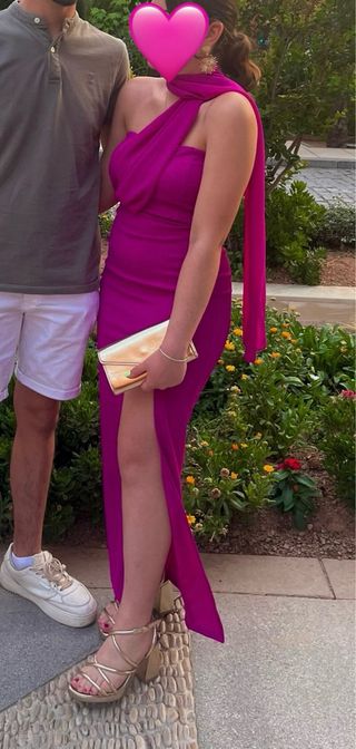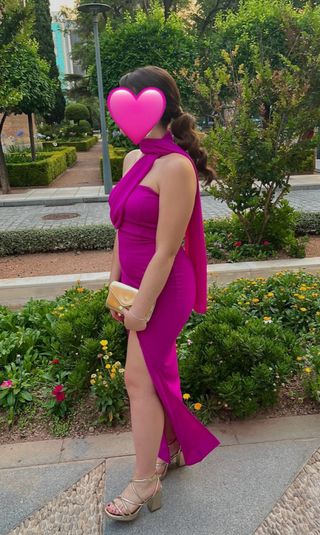 Usado un solo dia Vestido largo color buganvilla de Sorellas. Corte ajustado, escote halter con tela cruzada en la parte delantera y tiras largas al cuello. Abertura lateral en la pierna. Tejido elástico que marca la silueta.