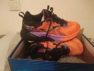 Zapatillas deportivas Joma TR-B con un diseño llamativo en naranja y morado. - Detalle de diseño con hojas tropicales. - Inscripción FLY.REACTIVE en la suela.