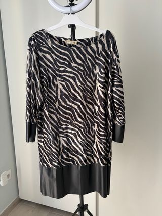 Vestido con estampado de cebra y detalles en polipiel. - Diseño de cebra en blanco y negro. - Mangas largas. - Bajo y puños en polipiel negra.