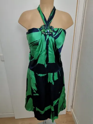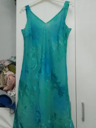 Vestido con un diseño degradado en tonos azules y verdes. Su tejido ligero lo hace ideal para diversas ocasiones. - Diseño sin mangas. - Escote en V.