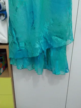 Conjunto de tres piezas: corpiño, falda y fular. - Tejido ligero y con brillo. - Diseño con volantes en la falda. - Talla 44.