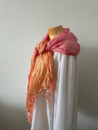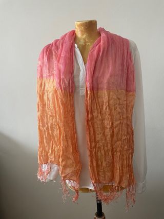 Fular de viscosa con un degradado de color entre coral y amarillo. Presenta un tejido ligero y con textura. - Material: Viscosa. - Diseño: Degradado de color. - Acabado: Flecos en los extremos. 156 x 58cm