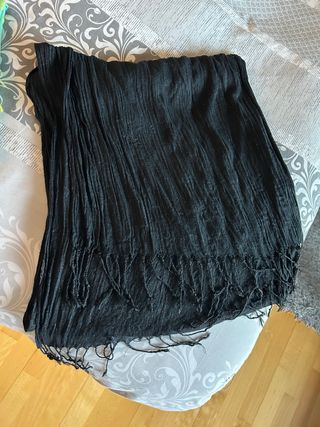 Elegante fular negro con un acabado brillante y detalles de flecos en los extremos. Su textura plisada le da un toque especial. - medidas 46 x 200 cms. - Diseño con flecos. - Acabado brillante.
