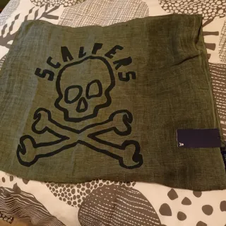 Fular de la marca Scalpers con un diseño de calavera y huesos cruzados. Estampado en negro sobre fondo verde. Medidas 70x200. Nuevo sin estrenar.