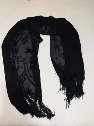 Elegante fular negro con un diseño floral semitransparente y detalles de flecos y encaje. - Material ligero y vaporoso. - Adorno de flecos en los extremos. - Patrón floral en relieve.
