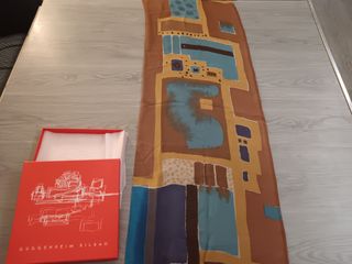 Preciosa fular de seda del museo Guggenheim Bilbao. Es una pieza única y elegante. - Diseño abstracto en tonos azules y marrones. - Material: seda. - Perfecto estado.