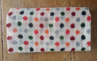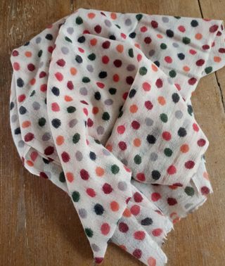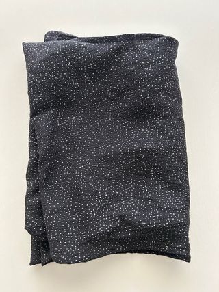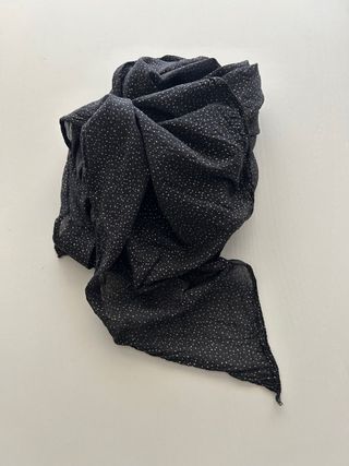 Fular de tela ligera con un diseño de pequeños puntos blancos ligeramente brillantes sobre fondo negro. Su caída es fluida y se puede anudar de diversas maneras. Mezcla de seda y algodón al 50% Mide 150cm de largo x 70cm de ancho, aunque acaba en pico de forma desigual