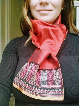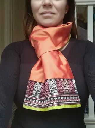 Elegante fular de seda con un diseño bordado en los extremos. Fulares de seda de doble Hilo, interior extra suaves, hechos y tejidos a Mano por la tribu Hmong en Vietnam. Perfecto regalo. Tamaño 165cm*20cm - Material: Seda. - Detalle de bordado y blancos sobre fondo negro - Colores disponibles: Naranja o Azul o Rojo oscuro Perfecto para regalo