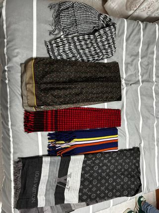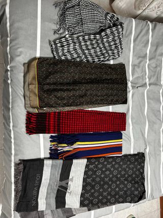 Lote de fulares con el distintivo diseño de la marca, uno de ellos de seda, tambien se venden por separado a 3,5 euros cada uno menos el de seda que es a 6 - Fulares con estampado de cuadros. - Fular con diseño geométrico. - Fular a cuadros en rojo y negro. - Fular con rayas de colores. - Fular con monograma.
