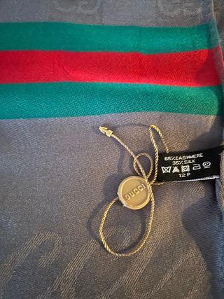 Elegante fular de la marca Gucci, confeccionado con una mezcla de cachemira y seda. - Composición: 65% cachemira, 35% seda. - Diseño con franjas rojas y verdes en ambos extremos. Con letras Gucci en ambos extremos y logo por toda la superficie. - Acabado con flecos en ambos bordes. - Incluye sello.