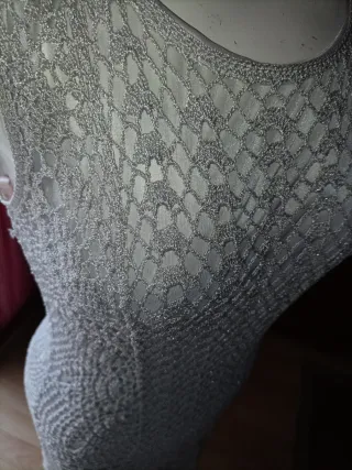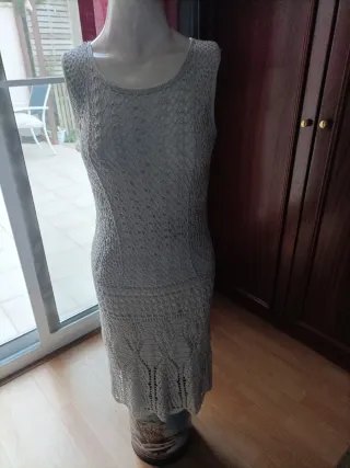 Vestido de hilo plata con un diseño delicado, ideal para lucir tanto en ocasiones especiales como en el día a día. Su tejido permite una caída elegante tiene forro De talla da,de 38 a 40,ya que tiene algo de elasticodad Regalo fular - Diseño de crochet intrincado. - Silueta que se ajusta al cuerpo. - Largo hasta la rodilla. - Acabado con un ligero vuelo en la parte inferior.