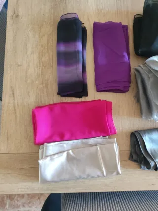 Conjunto de siete fulares de seda con un diseño degradado y colores vibrantes. 10€ por los 7 fulares, en caso de querer alguno suelto preguntar - Fular con degradado de morado a negro. - Fular de color morado intenso. - Fular de color rosa fucsia. - Dos fulares de color plateado. - Dos fulares de color gris plateado.