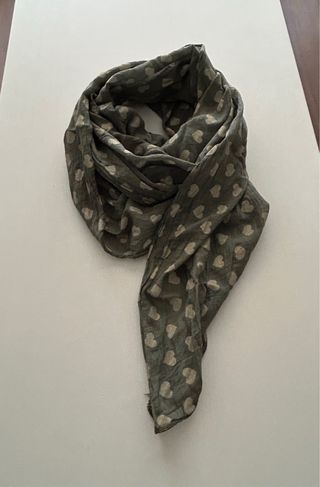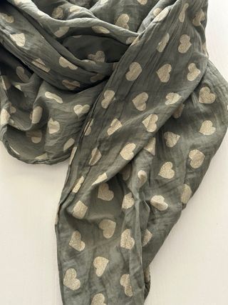 Monísimo fular verde con corazoncitos dorados ligeramente brillantes (en la foto no se aprecia muy bien) acabado en pico desigual. Mezcla de algodón y seda al 50% Etiqueta de la composición cortada Mide 150cm de largo x 70cm de ancho
