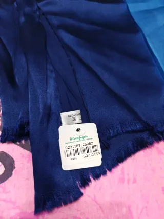 Es nuevo a estrenar con etiqueta. Elegante pañuelo fular de seda natural. Un accesorio versátil y de alta calidad. - Material: 100% Seda Natural. - Acabado con flecos en los extremos. - Diseño en tonos azules y morados.