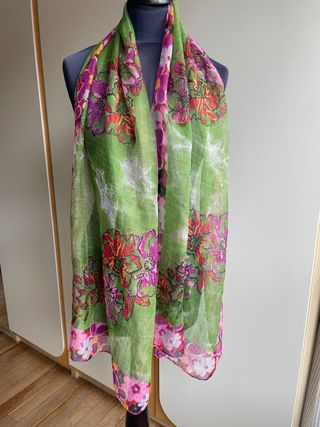 Preciosa bufanda de seda con un diseño único. Es de talla única y luce colores vibrantes. - Estampado multicolor pintado a mano con tonos rojos y verdes. - Tejido suave y fluido. - Muy poco uso.
