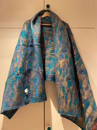 Elegante fular con un diseño único. Hecho a mano en Nepal - Tejido de lana y seda. Suave, abrigado y ligero. - Combinación de colores azul y dorado. - Medidas: 200cm x 90cm