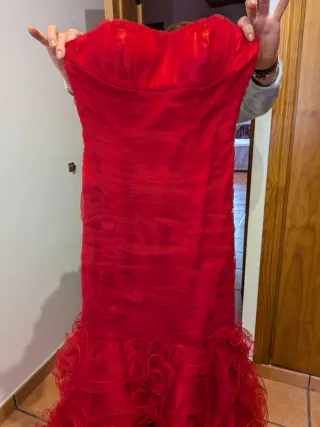 Elegante vestido largo de color rojo, ideal para bodas, eventos o fiestas. - Diseño strapless. - Falda con volantes y voluminosa. - Cremallera en la espalda. Precio original 400 euros.Tiene el fular a juego. Necesita tintorería porque está algo sucio de lo que arrastró hasta la iglesia. Después me recogí la cola y se quedó en buen estado. Está muy bien conservado. Muy elegante, no me lo puedo probar porque se me ha quedado pequeño. Equivale a una S/XS