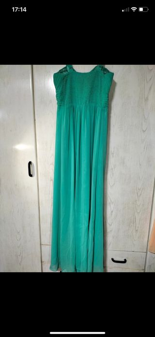 Vestido fiesta largo color verde turquesa de gasa con forro debajo. Tiene también a juego fular de gasa. Talla 40. Como nuevo. Puesto sólo una vez.