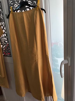 cintura falda 34, largo 104. Corpiño 42 cm x 27 cm. Fular 71 cm x 200 cm. Color dorado. Tiene una pequeña mancha en el bajo. Opcion tirantes.