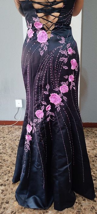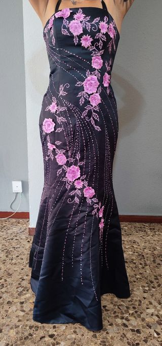 Vestido ceremonial mujer, talla 40 aprox. en buen estado utilizado solo dos veces. Solo le faltan algunas perlitas. Se regala el fular a conjunto color fucsia y sujetador. Vestido color negro y flores color fucsia.