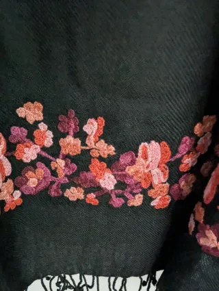 Elegante fular negro con un delicado bordado floral en la parte inferior. - Diseño con flores bordadas en tonos rosas y rojos. - Flecos en el borde inferior.