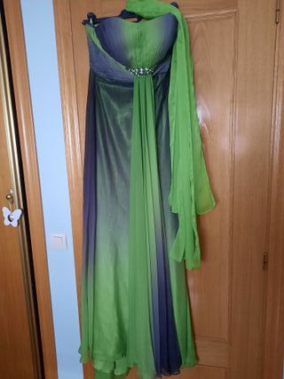 Bonito vestido largo puesto una vez para boda, cuerpo transparente de gasa con pedrería , tapando el pecho con cazuela, tonos morados, azulados y negros, muy elegante, con fular ancho para poder echarlo sobre los hombros T. 38,40, impecable ,llevado a tintorería. Comprado en Mercurio C/Mantería, me costó cuatrocientos y pico euros. CHOLLO!!! 190€