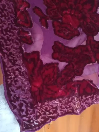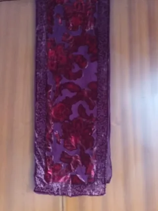 Elegante fular/chal de terciopelo y gasa. Colores: Predominan los tonos burdeos, rojo y ocres. Diseño: El patrón es intrincado, combinando motivos geométricos entrelazados con elementos que evocan el arte islámico. Medidas: 170x50cm